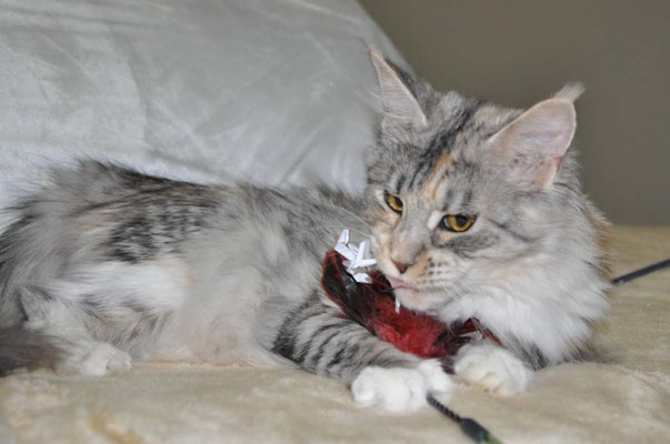 When it comes to playing toys, Maine Coons are not picky! From catnip mice to laser pointers, having a variety of options for your fluffy companion is essential. Though Maine Coon cats are not the most active breed out there, ensuring they get exercise is critical to reducing some health risks. At EuroCoons, we highly recommend getting your new cat at least one cat tree or some other type of perch in addition to toys. They can work their claws and observe from a higher place, which may also save your furniture from scratching, as all EuroCoons cats are prohibited from being declawed.