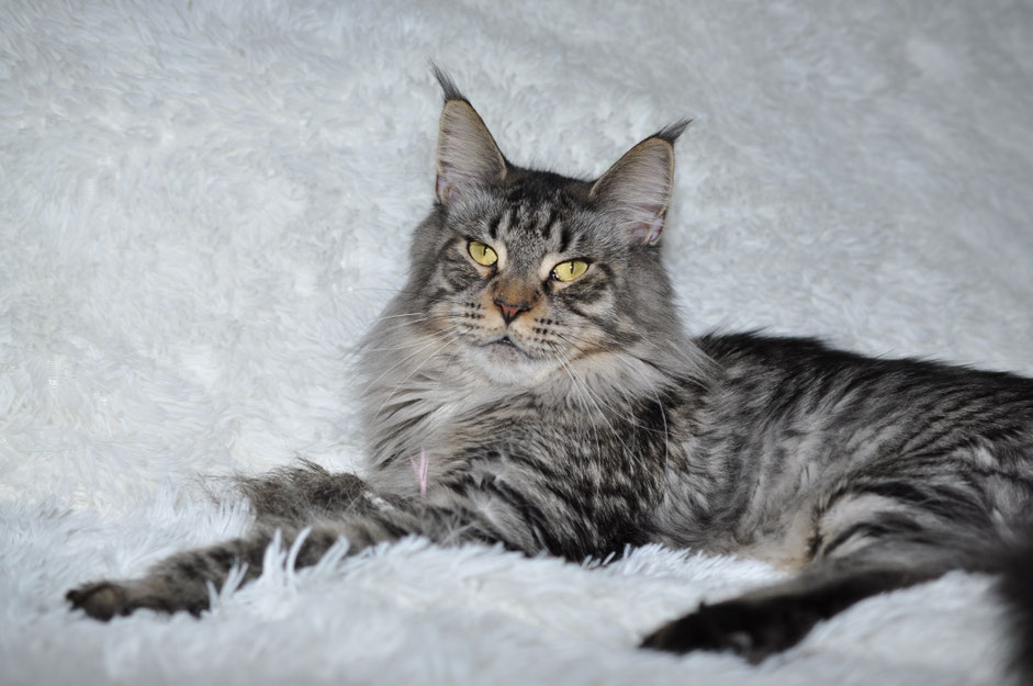 Physically, they are easily recognizable by their large, muscular bodies, square muzzles, and beautiful bobcat-like ears. Our cats are well known for having exceptionally long tails, even for the breed. Most adult Maine Coons cats will mature to weigh between 12 to 18 pounds on average. EuroCoons' Males will grow more prominent, with some even getting to be more than 25 pounds. We have had some in the past that hit the 33-pound range at under three years old. It is important to note that every kitten is different, and the weight will range. Being such a large breed, the Maine Coon is slower to mature, with most adults not reaching complete growth until about 3 to 5 years old. Their coats are long and require regular grooming. Though long-haired, the Maine Coon's coat doesn't shed excessively as long as you brush them out at least weekly. Our kittens have remarkable coats in textures, colors, and patterns. A high-quality diet of raw food and supplements is critical to maintaining their luxurious coats and overall health. For more information on the feeding regiment at EuroCoons Maine Coons Cattery, visit our Maine Coon Health & Diet page.