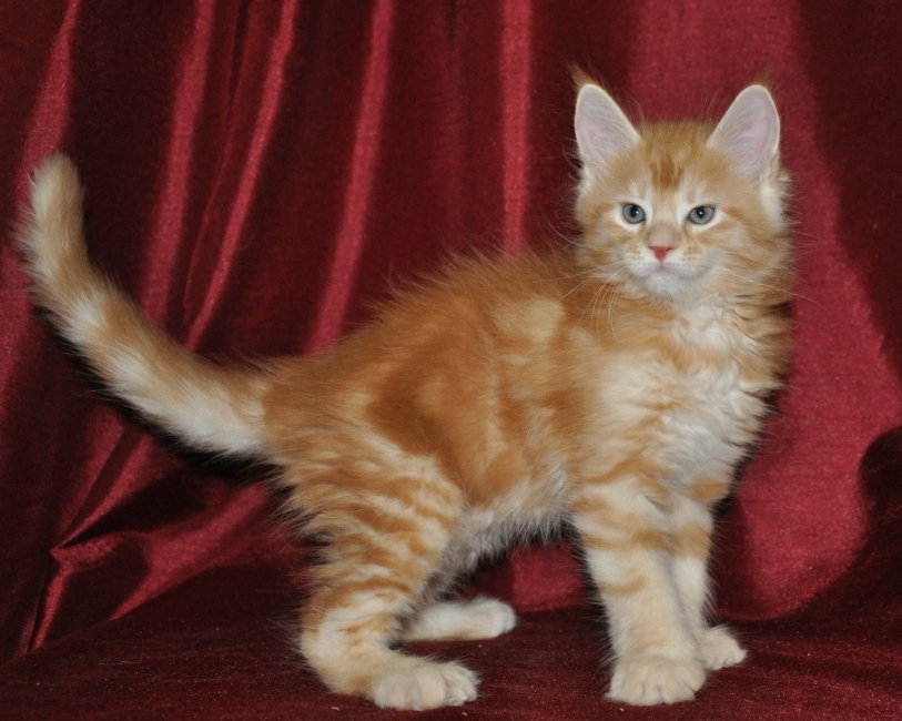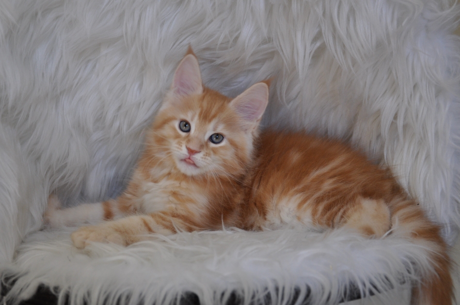 Introducing EuroCoons Meme♂, a magnificent Maine Coon kitten that exudes charm and charisma. This extra-large male boasts a bright and distinctive Red Ticked Tabby coat, making him a true standout among his feline peers.