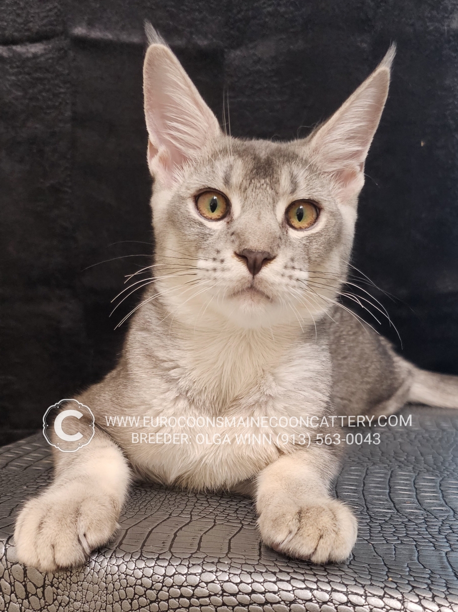 Introducing Elatra, a captivating female Maine Coon kitten available from EuroCoons. Born on October 19, 2022, she's a playful and affectionate companion who will steal your heart with her irresistible charm. Elatra is a Pale Silver Spotted Mackerel Tabby with a soft, lustrous coat featuring cool hues and an intricate pattern of spots and stripes. Her large, expressive eyes and tufted lynx-like ears add to her majestic appearance.
